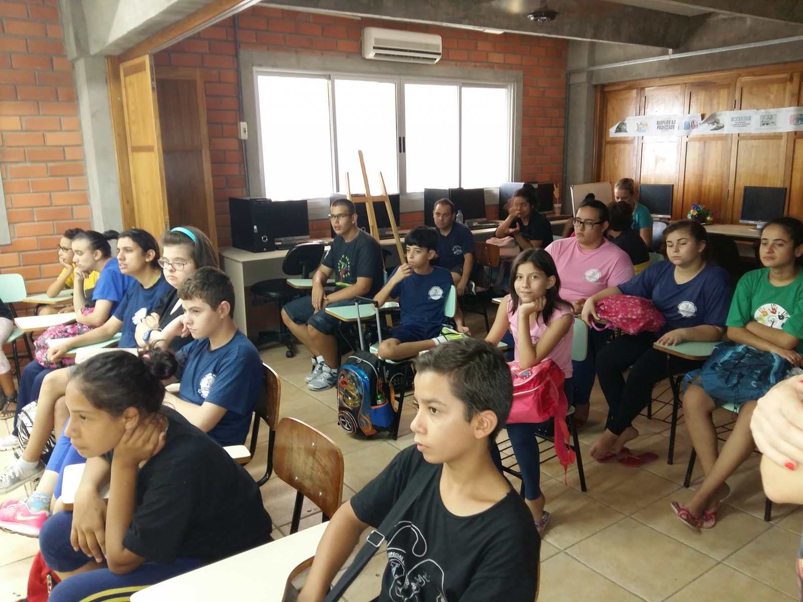 Os estudantes, Bruna, Laura e Lucas, do Curso de Fonoaudiologia da Universidade Federal de Ciências da Saúde de Porto Alegre (UFCSPA) que realizam estágio semestral curricular de Fonoaudiologia em Grupos na Escola Especial para Surdos Frei Pacifico, preparam a palestra de acordo com o tema elegido e apresentaram em um momento onde todos os grupos estavam reunidos em um mesmo espaço – o centro social.