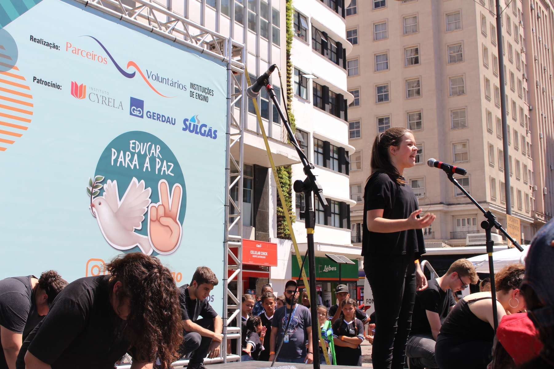 Elas aproveitaram o evento Tribos* que estava ocorrendo no Centro Histórico, em frente ao Mercado Público. O grupo teatral do Colégio Rainha do Brasil (integram duas de nossas alunas surdas) se apresentou com a peça “Seja menos preconceito. Seja mais amor e respeito”. Lindo D+!