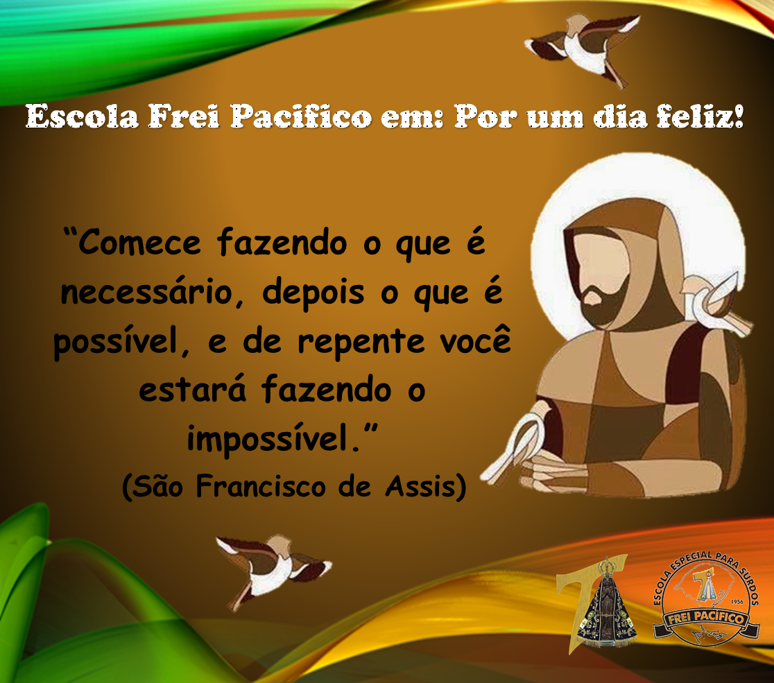 Por um dia Feliz! São Francisco de Assis 17/05/2021 Pelas palavras de São Francisco de Assis, cuide, abrace alguém. Escola Frei Pacífico em: Por um dia feliz! #EducaçãoqueTransforma #AmorqueTransborda